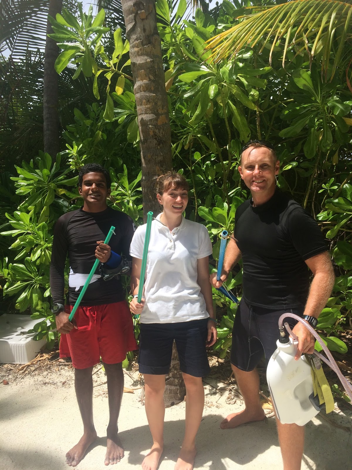 | Marine Biologist, Emma and Dive Team members Harvey and Layyan preparing to eradicate COTs on our House Reef |