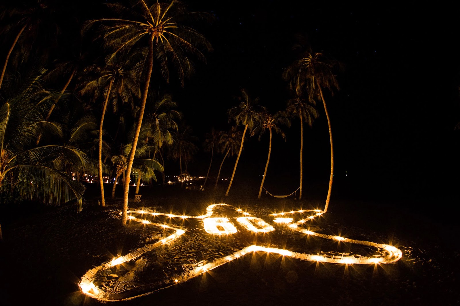 Towards the evening we made a 15 meter “60+” display on the sand, and invited everyone to come and lend us a hand, with lighting the candles. Our candles were made in-house, from half coconuts filled with old kitchen oil.