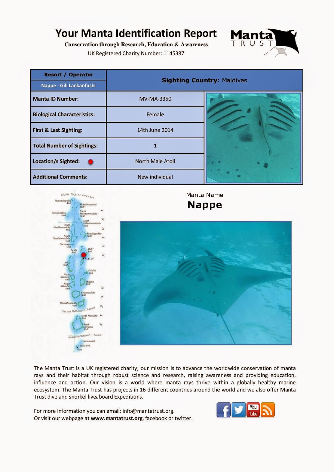 Working closely with the Manta Trust, Vaidas and I work hard to photographically track the Manta rays we spot. We do this by taking photographs of the ventral side (belly), upon which is a black spot pattern unique to each individual, like a finger print. By comparing our image to the National Database of 3350 mantas, we can determine and track the migrations and health of each individual in the Maldives. We try to encourage guests to help us out, and this month we have had several guests kindly donate IDs from their dives!