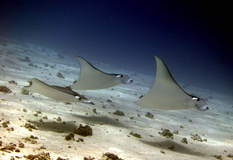 | Three Short-fin Devil Rays (mobulas) gliding through the water . They will often be found in schools of between 3-20. Credit: Josie Chandler |