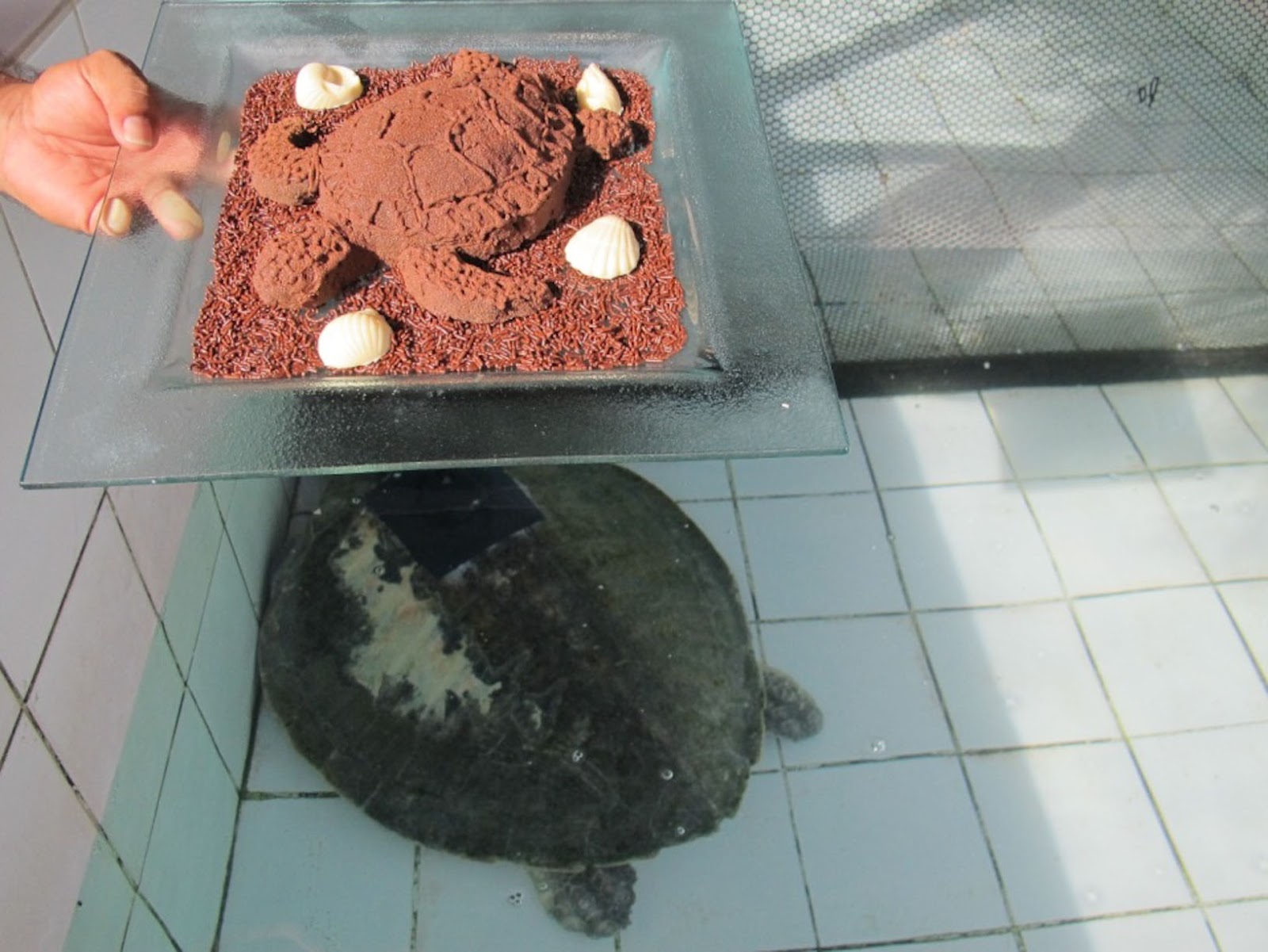 The other turtle Chippy (for the full story click here), was much bigger, and had much bigger problems. Our hosts found it tangled in a big piece of ghost net. Both of it’s front limbs were injured, with the front left flipper lacerated to the bone by the abrasion with the fishing net. This turtle was sent to Kuda Huraa, from where it was further transported to Four Seasons Resort at Landa Giraavaru (in Baa Atoll), where sadly, the left flipper had to be amputated, due to the severity of the trauma. Three months later, thanks to the great amount of care by Marine Biologists at Four Seasons Landaa Giraavaru the turtle has healed. A satellite tracking device was attached to Chippy and on the 7th of November and after a goodbye ceremony with a special cake (see the picture) she was released !