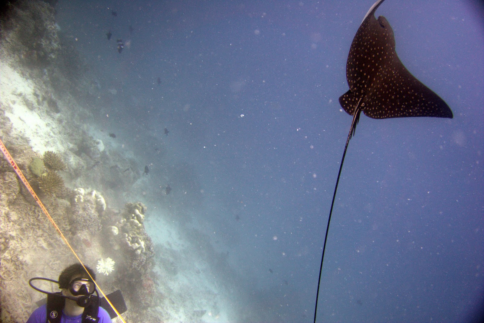 Using similar methods, I was excited to be involved with implementing a new project on our house reef regarding the behaviour of the Crown of Thorns Starfish (Acanthaster planci). This species occurs naturally in Maldives however, recently we have been seeing outbreak populations which can decimate reefs by eating the corals. Debs tells me that they have removed over 2000 individuals from the surrounding reefs in about 8 months! These starfish can be quite cryptic- hiding in crevices in the reef- making it difficult to remove them. It was our aim to discover how the starfish act during different times of the day at different depths, thus allowing us to determine the most efficient time and depth to begin our next set of removal efforts! During one of our survey dives, a friendly eagle ray came to inspect our transect tape! It was amazing to witness this bizarre behaviour as she flew in from the blue, right towards me!!